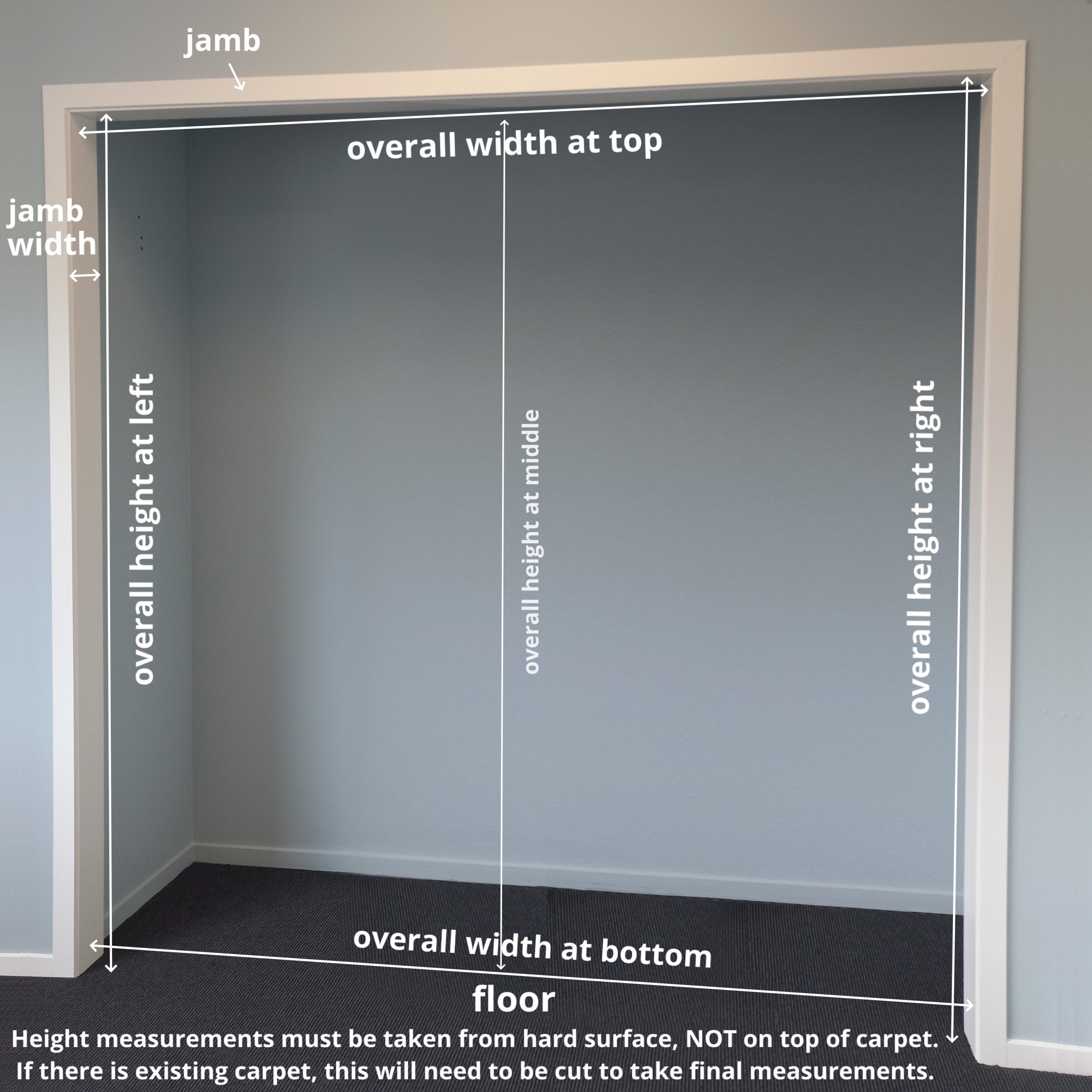 Measure your wardrobe frame opening. You will need to take 5 measurements as below.
