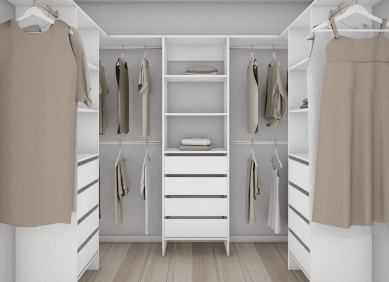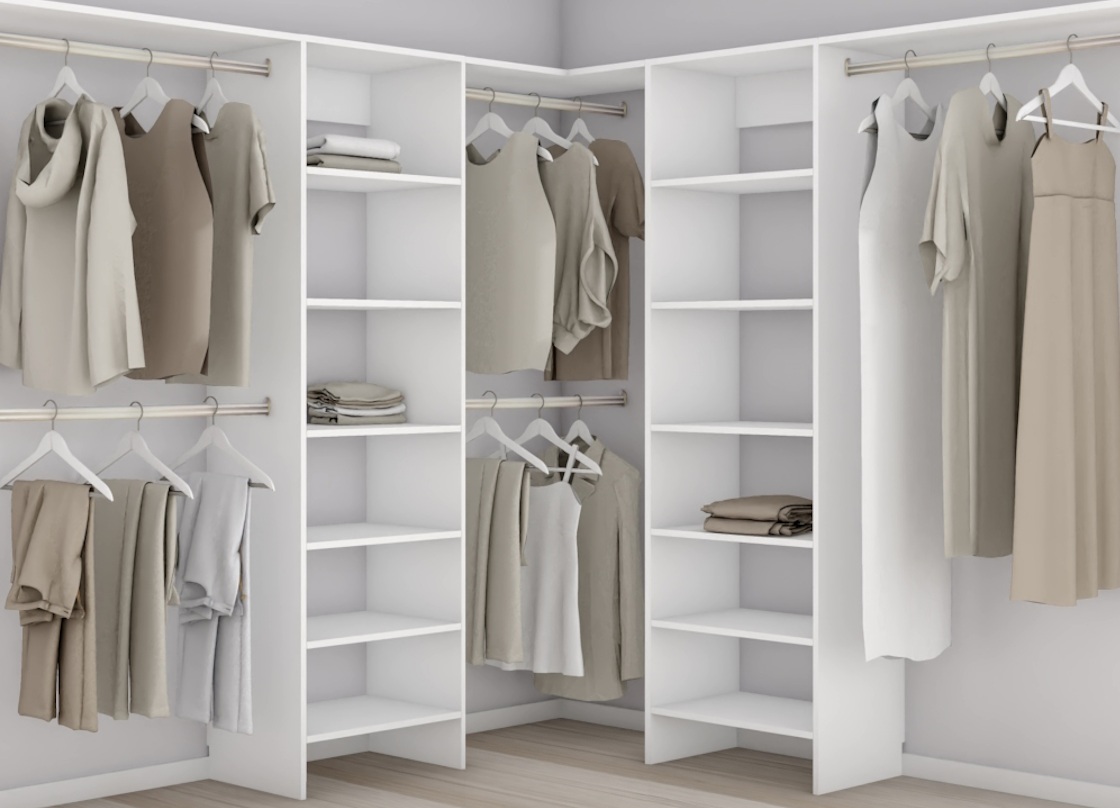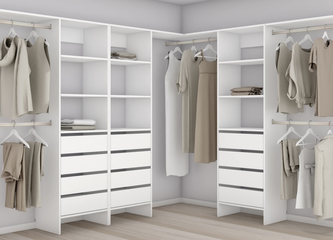 Corners – When a walk-in wardrobe requires fitting around a corner, we recommend hanging clothes into corners. This is the most practical use of a corner and coat hangers can glide along the rail making access easier. Hanging clothes can take up as much as 600mm in depth (shoulder to shoulder) so when clothes hanging into a corner, 700mm space on the adjacent side must be allowed when planning multiple units.