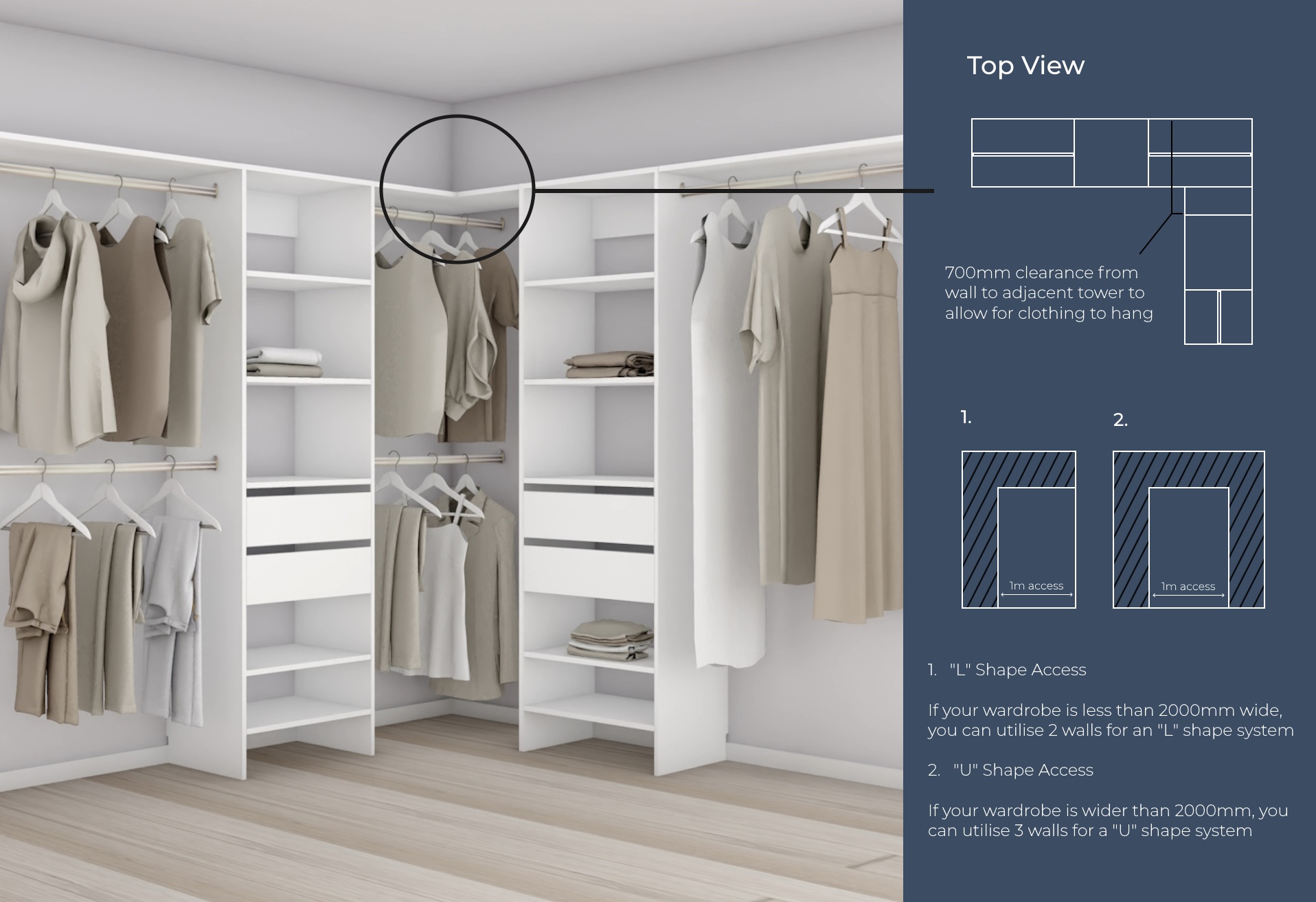 Ideally you want to have 1000mm (1m) wide pedestrian access to allow yourself to stand back to view your clothing, pull out drawers and easily access items in your wardrobe. If your wardrobe is 2000mm or wider then you could utilise 3 walls for a U-Shape system.
