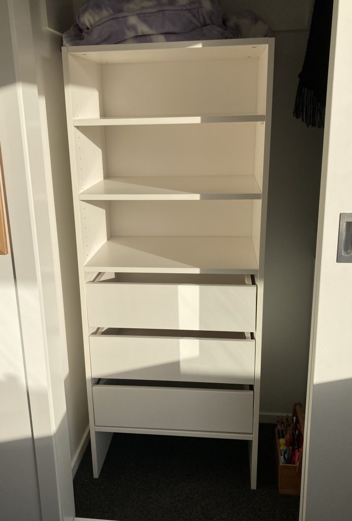 We are so pleased with our purchase. It has made a big difference to our wardrobe space, we have more spaces to store items we wanted but didn’t know where to put. Plus we get three extra drawers for clothes. The quality is good and it wasn’t too difficult to put together. This has a much nicer finish than other ready-made products that we looked at in the big hardware stores.