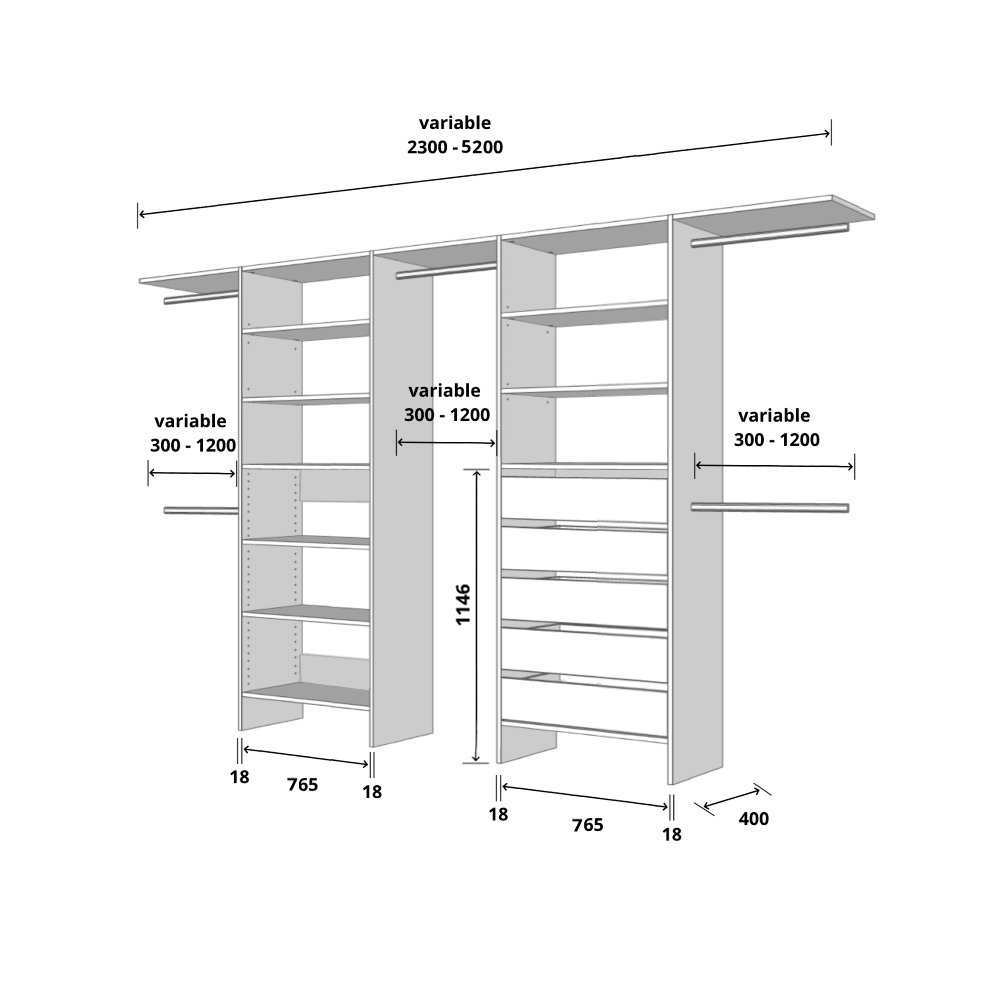 Wardrobe Size Requirements – Fits Wardrobes from 2500mm up to 5200mm wide