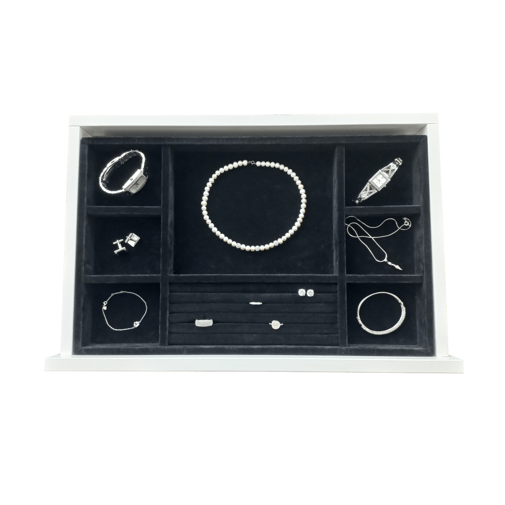 Jewellery tray sits raised within your drawer, creating hidden compartments underneath for concealed storage.