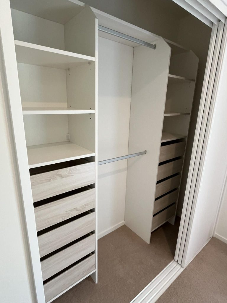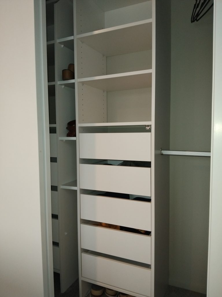 Initially, assembling the wardrobe was confusing and time taxing. What should’ve taken us a few hours to assemble, took us ALL DAY. I felt the cam connectors for the tower were a little too small which ultimately split the pre drilled holes, considering the price of the whole wardrobe system – this felt a bit cheap. The instructions weren’t as straight forward as they were made out to be. However, we got there in the end and overall, i love the finished product. Very sturdy, looks nice and tidy and is fit for purpose.